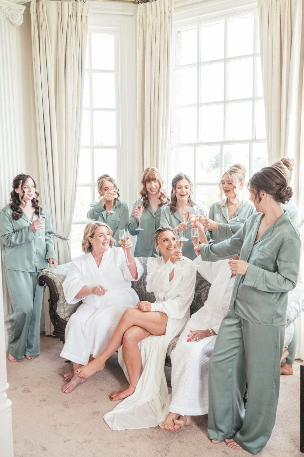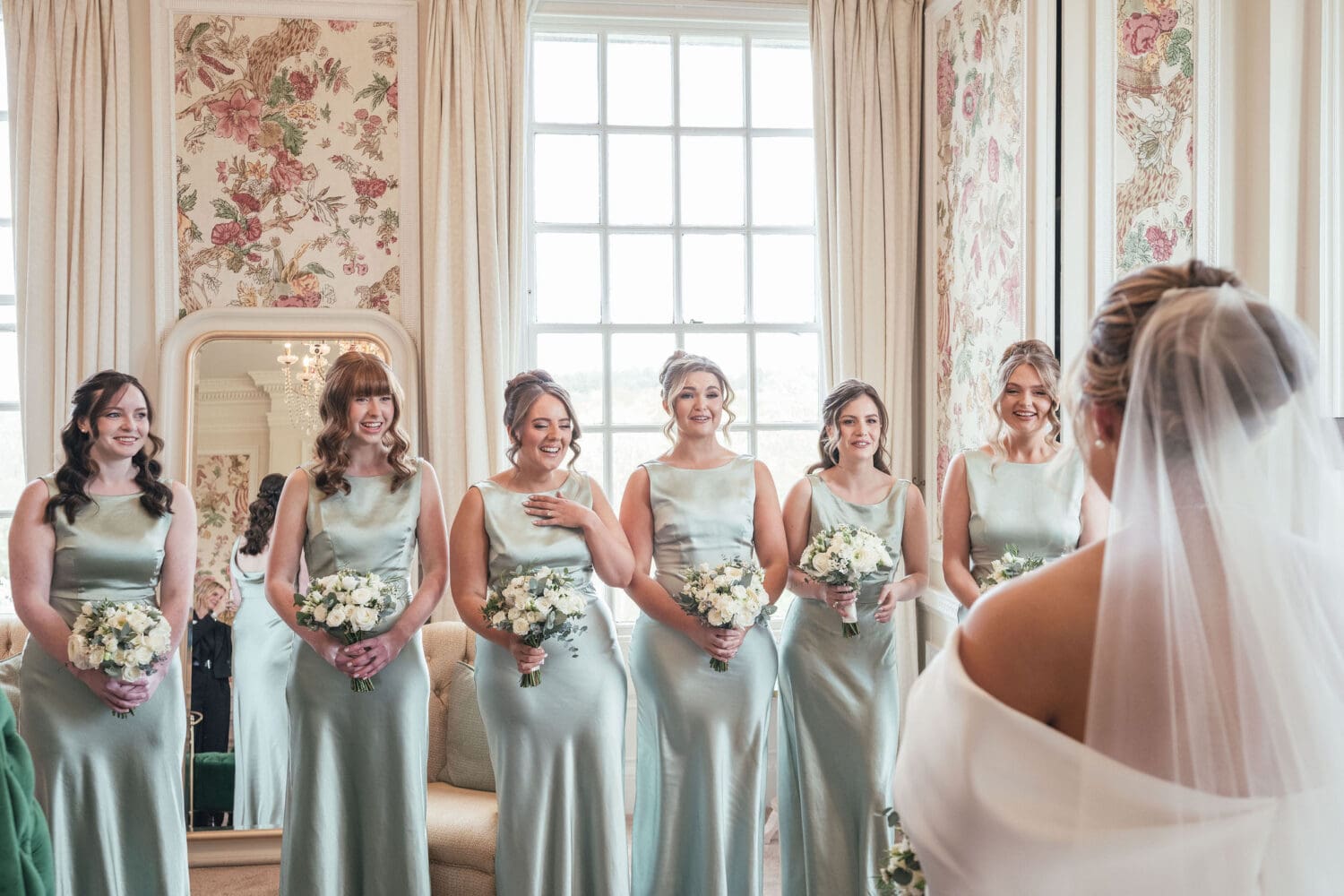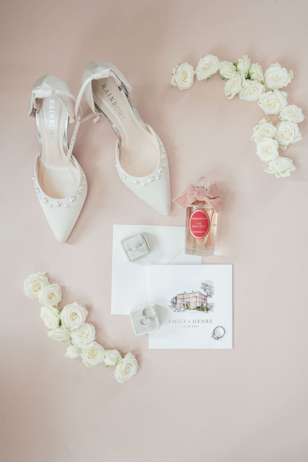 Emily and Henry’s vision was classic with subtle playful touches: whites, creams, greenery, hints of blush pink, and light sage green bridesmaid dresses. The overall look was refined and effortless, ideal for editorial-style photography that will age beautifully over time.
