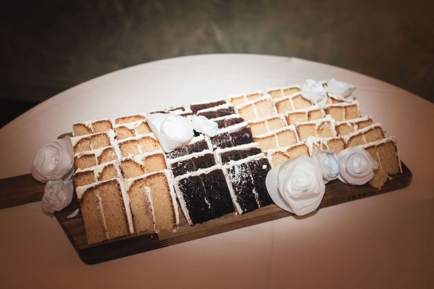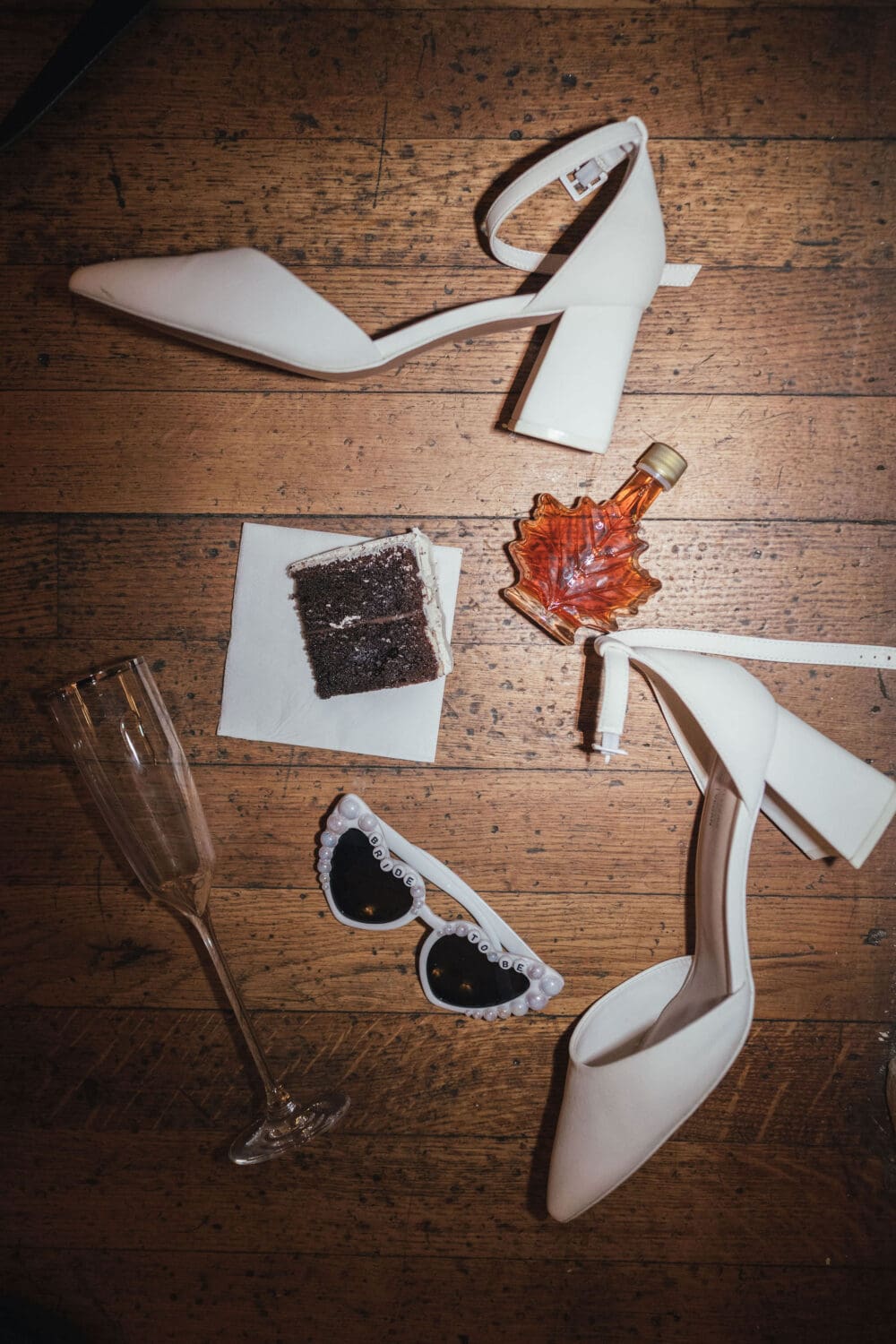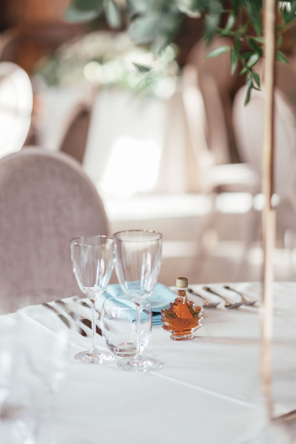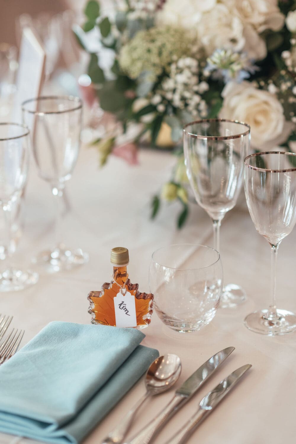 They chose to give a nod to Canadian life, where they had moved together, with maple syrup favours for each guest. These also doubled as a place setting with calligraphy name tags.
